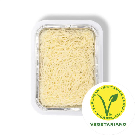 Ingredientes: Salsa bechamel (60%) (leche pasteurizada, harina de trigo, aceite refinado de girasol, cebolla sofrita [cebolla, aceite de oliva virgen, sal], sal, conservador [sorbato potásico, ácido sórbico], almidón modificado, nuez moscada), relleno del canelón (espinacas[15%], leche pasteurizada, harina de trigo, mantequilla, cebolla sofrita [cebolla, aceite de oliva virgen, sal], piñones, sal, conservador [sorbato de potasio]), pasta alimenticia fresca cocida (sémola de trigo duro, harina de trigo, agua), queso emmental rallado (5%).